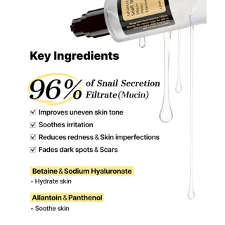 سرم اسنس حلزون کوزارکس، پوستی درخشان، شفاف و مرطوب با اسنس محبوب و پرفروش کوزارکس! این محصول حاوی ۹۶٪ فیلترات ترشحات حلزون است که با قدرت ترمیمکنندگی بالا، به بازسازی پوست آسیبدیده، کاهش جای جوش و لکهای تیره کمک میکند. بافت سبک و زودجذب آن بدون ایجاد چربی یا حس سنگینی، رطوبت عمیق و ماندگار را به پوست شما هدیه میدهد. حاوی ۹۶٪ ترشحات حلزون برای ترمیم و بازسازی پوست، آبرسانی عمیق و جلوگیری از خشکی، بهبود بافت پوست و افزایش شفافیت، کمک به کاهش قرمزی و التهاب، مناسب برای انواع پوست، حتی حساس.