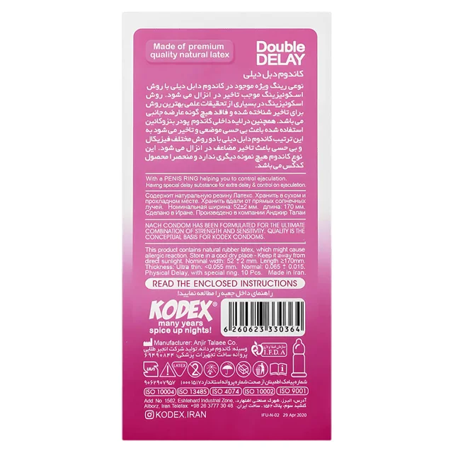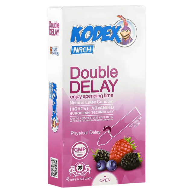 این کاندوم با نام «دابل دیلی» (Double Delay) از دو روش همزمان برای تأخیر در انزال استفاده میکند. اول، یک حلقه لاتکسی فیزیکی در فاصله حدود ۴ سانتیمتری نوک کاندوم قرار دارد که با اعمال فشار بر ناحیه ختنهگاه، از انزال زودرس جلوگیری کرده و به حفظ سفتی کمک میکند. دوم، بنزوکائین (ماده بیحسکننده) در لایه داخلی، حساسیت را کاهش داده و تأخیر را افزایش میدهد. این محصول از لاتکس طبیعی (ضدآلرژی) ساخته شده، دارای روانکننده با رطوبترسانی بالا و رایحه مطبوع میوهای است و بسیار مقاوم طراحی شده است.
