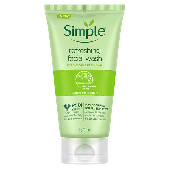 ژل شستشوی صورت Simple Refreshing Facial Wash یک شوینده روزانه و ملایم است که بدون ایجاد خشکی یا حساسیت، پوست را عمیقاً تمیز و شاداب میکند. این محصول فاقد صابون، عطر، رنگ و مواد شیمیایی مضر بوده و برای پوستهای حساس نیز مناسب است. وجود ویتامین B5 و E به پاکسازی آلودگی، چربی و آرایش کمک کرده و نرمی، لطافت و تعادل طبیعی پوست را حفظ میکند.