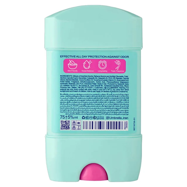 استیک زنانه سافت کلیر آمبرلا حاوی روغن نارگیل، شی باتر و ویتامین E بوده و یک دئودورانت با ویژگی ضد حساسیت و ضد باکتری می باشد. این محصول، فاقد الکل با ماندگاری بالا بوده و دارای قابلیت محافظت از پوست و خاصیت نرم کنندگی با ترکیبات مفید برای انواع پوست معمولی، چرب، خشک و حساس است. استیک زنانه سافت آمبرلا با جذب سریع و رایحه دلپذیر خنک و شیرین گل و گیاهان معطر، از بهترین محصولات ضد بوی بد عرق برای پوست حساس محسوب می شود.